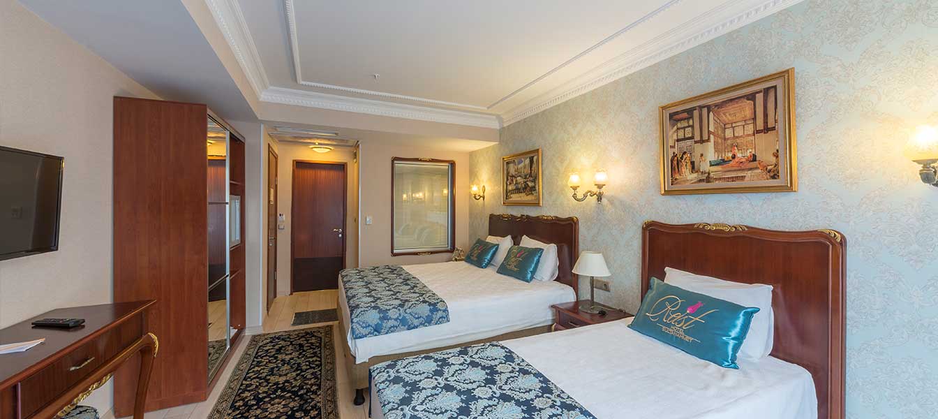 The family room offered by the Rast hotel is perfect for parents accompanied with a child. These family rooms for rent in hotel Istanbul have the option of one king size bed along with a single bed. These rooms are much more spacious than the standard or double rooms and the balconies help in keeping the room airy and refreshing. You will find every facility that you need within these rooms and if you require anything else, just let us know and we’ll be happy to help you. If you are wondering what exactly you can find in these rooms, wonder no more because we are here to tell you exactly what we offer.